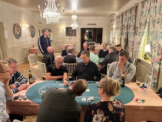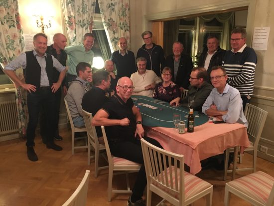 Sedan två bord med förväntansfulla, smygande, dolskblickande gubbar. I år med Caroline Anundgård som proffsdealer och med undertecknad som osjälviskt kunde sprida korten. Det gick som man kunde förutse; några var för ivriga med att satsa sina knappa resurser och föll därför ur, en efter en, som skjutbaneankor på ett tivoli. Nåväl, efter denna sållning av agnarna från vetet samlades sju ännu mer förväntansfulla (och edsvurna, detta efter att ha bluffat ut sina tidigare kamrater) för att göra upp om topplatserna. De som inte fick vara med fylkades runt finalbordet och blev där plötsligt experter? Hur det gick till förtäljer inte historien.
