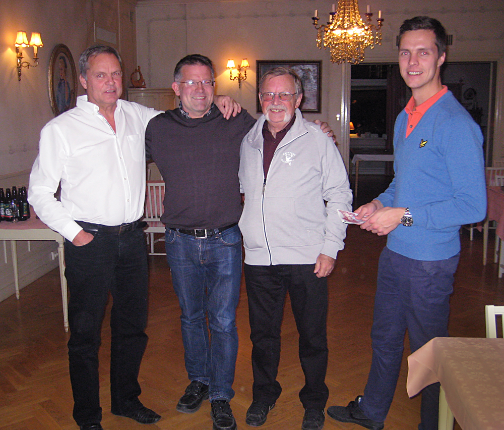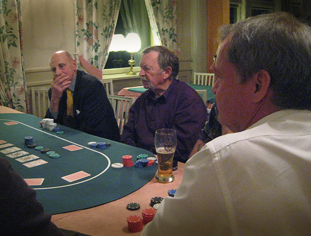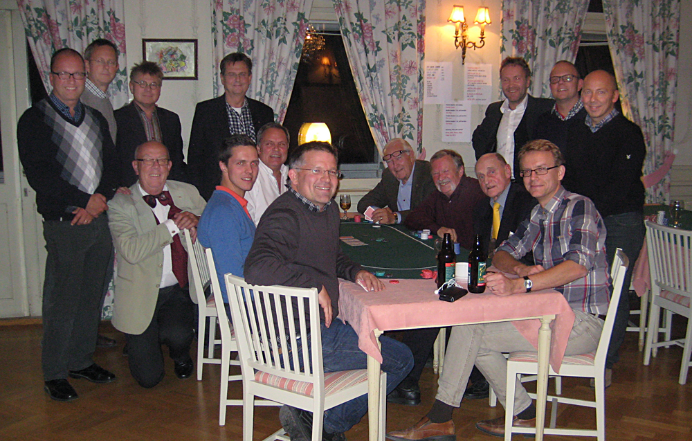 Efter aväten pytt med tillbehör grupperades alla kring den som alltid eminente dealern Pontus Ekberg. Tur att han fanns till hands för att avgöra de ofta knepiga situationer som då och då uppstod när potterna skulle grupperas. I år var vi så många att vi hade två bord med semifinaler och därefter ett finalbord. I olika rask försvann takt ”Ärret” Holgén, ”Smyget” Rudolfsson, ”Köraren” Sandell, ”Hummern” Skårman, ”Mercan” Vestlund, ” Djävulens adv” Victor, ”Översten” Wibom, ”Liraren” Tobbe Pettersson, ”den företagsamme” Christer Hedlund, ”Tvivlaren” Tomas Sundström och ”Kålle” Janne Bruce. Till sist återstod de tre som skulle göra upp om pallplatserna: förfjolårsvinnaren ”Pillertrillaren” Christer Näsström, ”runner upen” Gunnar Ekberg och ”Nilson” Pelle Simonson. Christer föll ur på sämre pace och den sista potten drevs mot oanade höjder med ”all in” från båda spelarna. Efter mycket lurpassande och knackande slutade det med Pelle Simonson som segrare. Grattis!