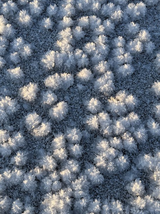 Frostrosorna förtjänar ett eget avsnitt. De var mycket vackra, 5–6 cm höga – titta på bilderna så förstår ni. Rosorna satt dessutom jämnt och tätt. Isrosor uppkommer vid snabb istillväxt i stark kyla. Då bildas mikrosprickor i isen som transporterar vattenånga till ytan, där iskristaller växer fram. När isen senare växer i tjocklek underifrån blir den tät, och kristallerna fortsätter då att växa med den vattenånga som finns i luften.